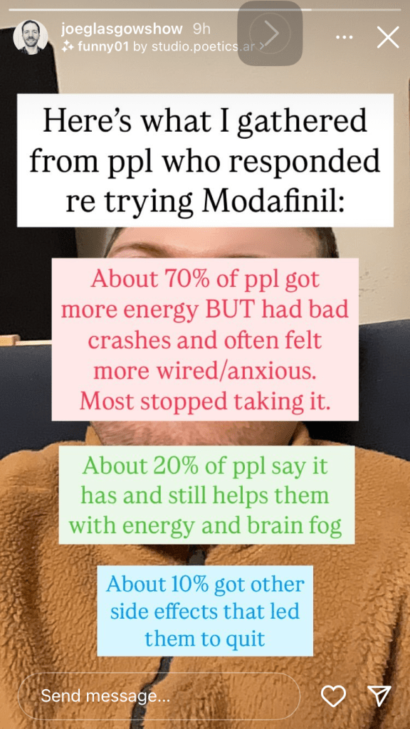 All of that to say: I dropped out of the study after having more time to think. This decision was further validated when I asked my long covid discussion group about this study and someone found a research study on the drug they’re testing. I didn’t read the full study but right there in the abstract it says “The use of wakefulness-promoting agents is discouraged for addressing unexplained fatigue, as seen in the context of chronic fatigue syndrome.” (ME was originally called chronic fatigue syndrome before more research was done to understand that the mechanisms are related to muscle, brain, and inflammation – myalgic encephalomyelitis is those words in Latin/medical. The name chronic fatigue syndrome is still common among people who do not understand the extent of the condition.)